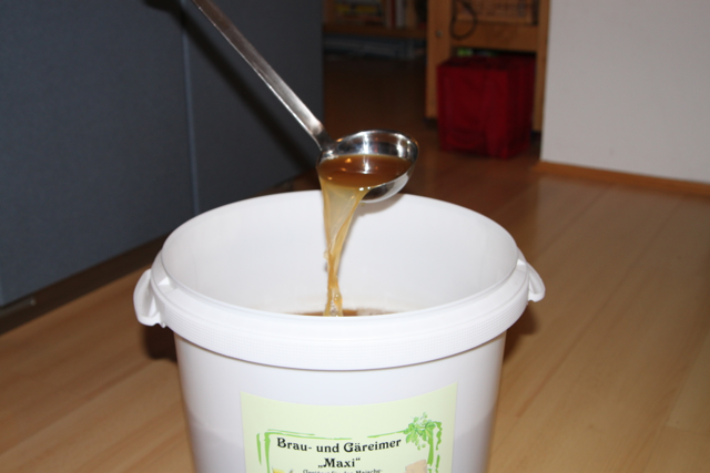 Die Hefe muss nun an der Oberfläche der Würze 30 Minuten rehydrieren. In der Zwischenzeit kannst du eine Küchenkelle gründlich abkochen. Mit dieser Kelle ziehst du die Würze im Anschluss mehrmals auf. Dazu tauchst du mit der Kelle in die Würze und ziehst die Flüssigkeit vorsichtig nach oben, so dass die Flüssigkeit in Kontakt mit der Luft kommt. Diese Zufuhr von Sauerstoff bringt deine Gärung gut ans Laufen. Verschliesse den Gäreimer wieder und positioniere das Gärröhrchen darauf, falls dein Eimer so etwas hat. Ansonsten legst du den Deckel nur leicht auf.